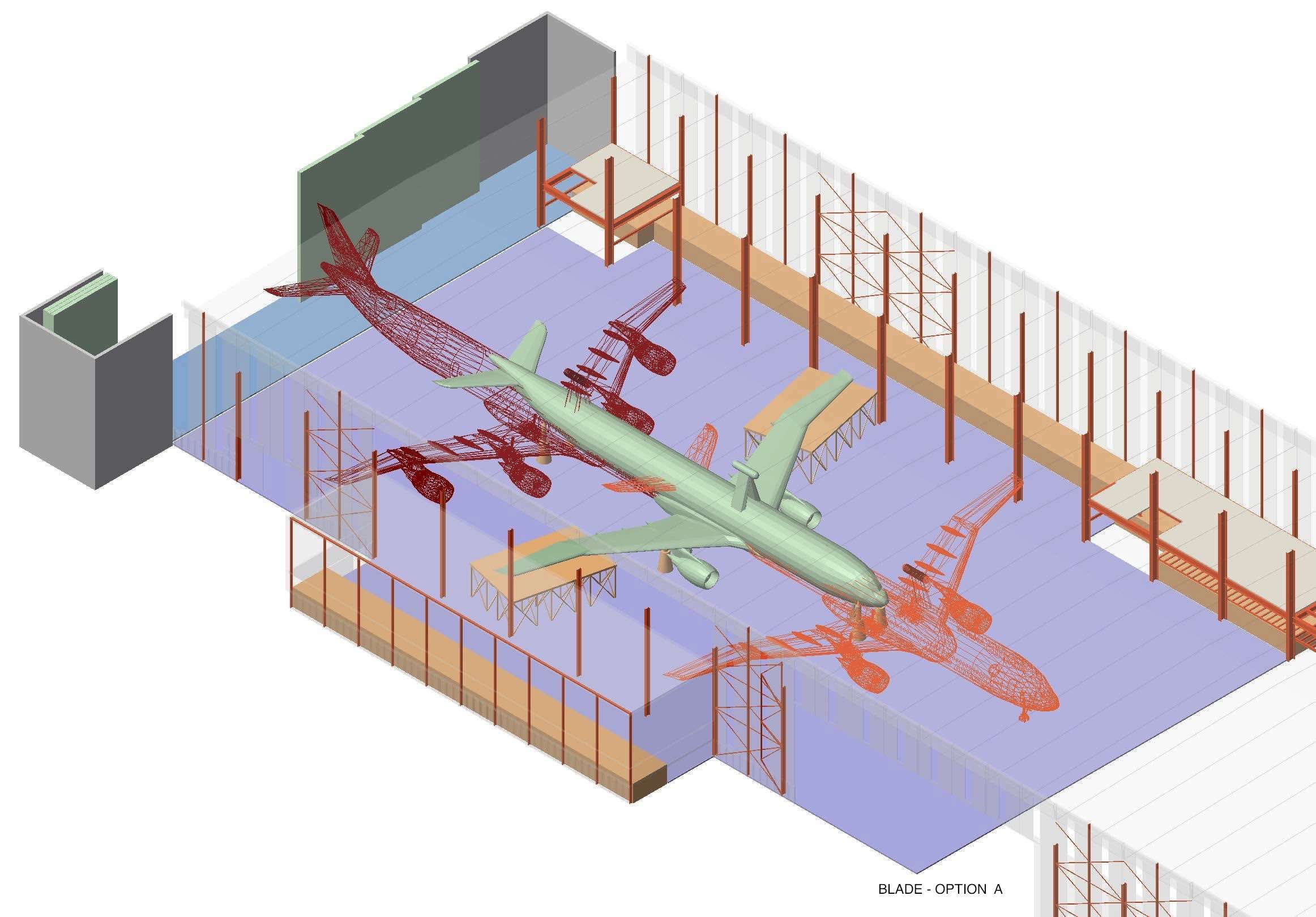 Etude prospective de réaménagement d’un hall aéronautique existant (Dassault - Programme Mercure) en centre de formation pour le pilotage et la maintenance des appareils avant livraison.